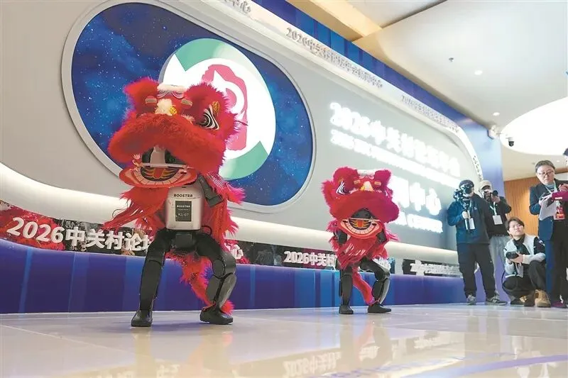 3月25日至29日,以“科技创新与产业创新深度融合”为年度主题的2026中关村论坛年会将在北京举行。论坛年会设置论坛会议、成果发布、技术交易、前沿大赛、配套活动等五大板块、百余场活动,将有来自100多个国家和地区的上千名嘉宾参与。图为3月24日,在中关村论坛年会新闻中心内,两台人形机器人在表演舞狮。新华社记者 鞠焕宗摄