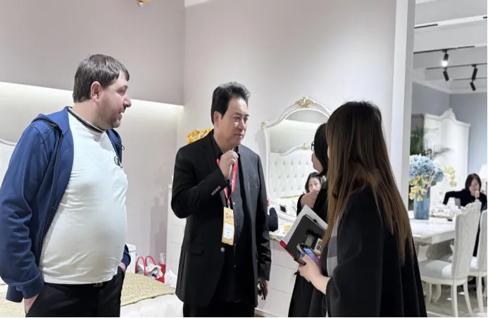 3月18日,第57届中国(广州)国际家具博览会在广州琶洲盛大开幕。以“链新”为主题,本届展会规模达85万平方米,集结了国内外5100余家优质企业,涵盖民用、办公等全品类板块。在国际形势复杂多变的当下,家博会不仅是一个展示平台,更是全球家居产业的信心枢纽,我们在此汇聚资源、链接供需,愿与各界伙伴共拓新局,携手推动行业在变革中换发正能量。玉环市家具行业协会积极组织本地出口家具企业参展。其中浙江欧宜风家具有限公司作为本届家博唯一参展企业,充分展现了服务产业链责任担当,为推动行业交流、稳定行业信心发挥了积极作用。黄会长与外商恰谈交流