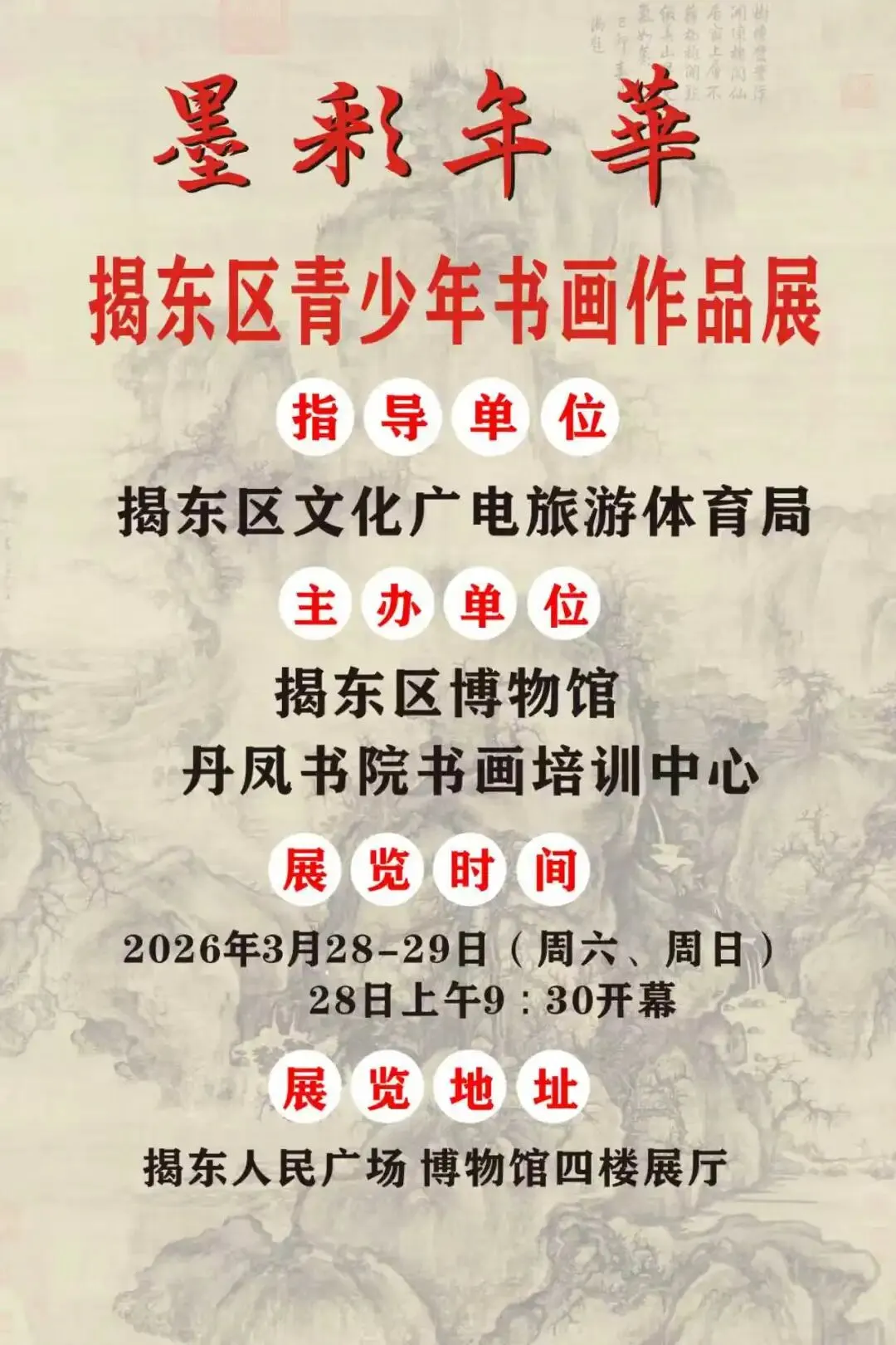 3月28日(周六)上午,展览将举行简短而隆重的开幕式,诚邀各界朋友拨冗莅临。在为期两天的展期里,让我们一同走进这群青少年的艺术世界,感受墨彩年华的独特魅力。