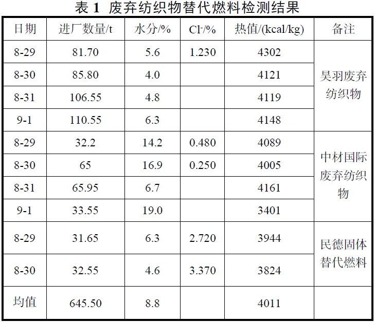 (1)窑台时产量:使用废纺前后,生产线生料喂料量下降10t/h,高温风机转速增加1Hz,通过对窑系统参数调整,替代燃料投加期间对整体窑况稳定性没有影响。