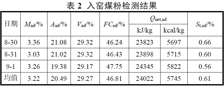 本次替代燃料系统改造项目要求,替代燃料处置能力≥300t/d,即12.5t/h,2024年8月30日00:00至2024年9月1日24:00统计替代燃料系统和窑系统运行数据,期间系统替代燃料及窑尾分解炉用煤量统计见表4,期间累计时长为72h,扣除烧成系统清理烟室总时长10.4h,即投入替代燃料使用时长是61.6h,累计消耗替代燃料769t,即替代燃料每天使用量为256.3t/d,替代燃料每小时使用量为12.5t/h,窑尾分解炉总用煤量为761t,即窑尾分解炉每小时使用量为12.4t/h。均满足合同要求。