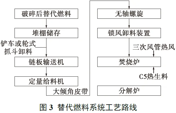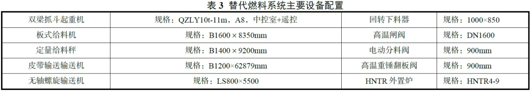 同时,从三次风管引热风进入HNTR外置炉,以加速替代燃料的燃烧过程。并通过C5分料至HNTR外置炉,以实现稳定控制炉温的目的。替代燃料工艺路线见图3,系统设备配置见表3。