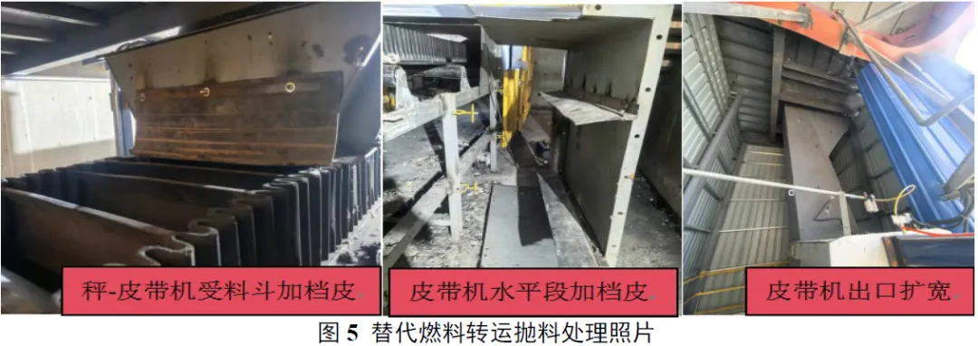 大粒径物料在转运过程中出现的抛料问题,其主要是通过严格控制替代燃料进厂粒径<100mm。但鉴于替代燃料来源及特性的多样性,物料中存在大颗粒及板结物料的情况,该系统运行过程中出现了定量给料秤至大倾角皮带机下料及皮带机出口至无轴铰刀出现抛料问题。