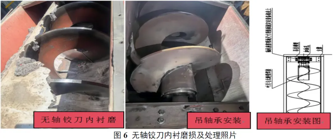该系统从皮带机至物料进炉前输送设备,从废纺物料具有缠绕和粘结性、回火及密封性等角度综合考虑采用无轴铰刀,因替代燃料种类繁杂及其含有杂质,导致物料在输送过程中与无轴铰刀内部耐磨衬板发生磨损,致使在无轴铰刀长度方向上叶片不在同一水平面,加剧设备运行风险。针对出现无轴铰刀内存磨损的问题,采取在无轴铰刀出口增加一套可自动调心的吊轴承来补正。