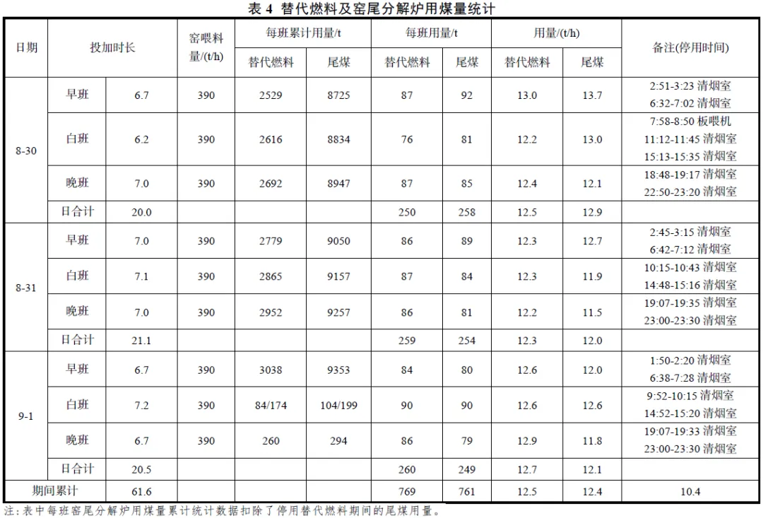 3.4.1 使用替代燃料时替代燃料及窑尾分解炉用煤量统计