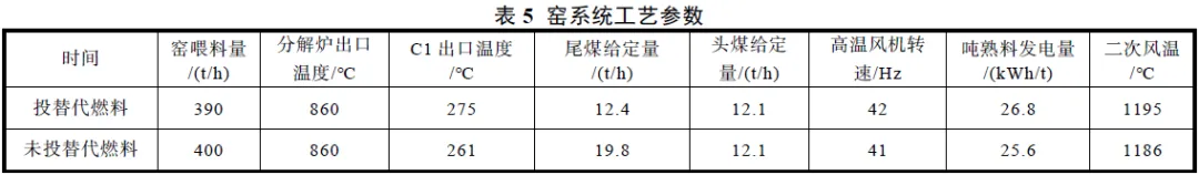 (5)替代燃料使用期间,分解炉、六级锥部及下料管结皮及外部温度较前期变化不大。