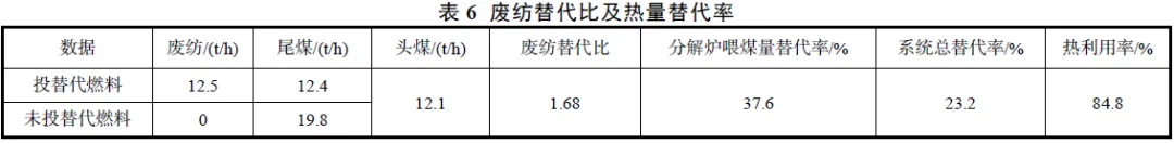 替代燃料和窑尾分解炉用煤量生产数据情况对比见下表6,使用替代燃料时,替代燃料使用量为12.5t/h,尾煤用量为12.4t/h;未使用替代燃料时,窑尾分解炉用煤量为19.8t/h,窑尾分解炉用煤量减少7.4t/h。此时,窑尾分解炉喂煤替代率为37.4%,总替代率为23.2%,按照煤粉低位发热量进行换算,1.69t废纺燃料可以替代1t煤,此时替代燃料热利用率为84.8%。