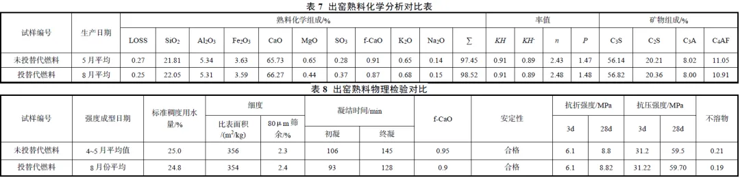 废纺替代燃料系统投入后,对熟料性能的影响,出窑熟料化学分析对比详见表7,出窑熟料物理检验对比详见表8。