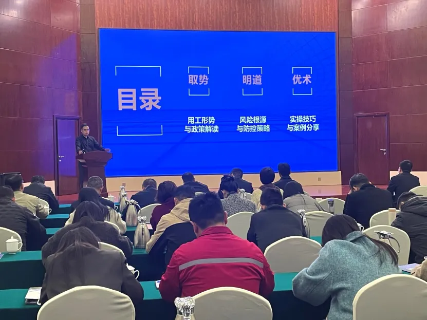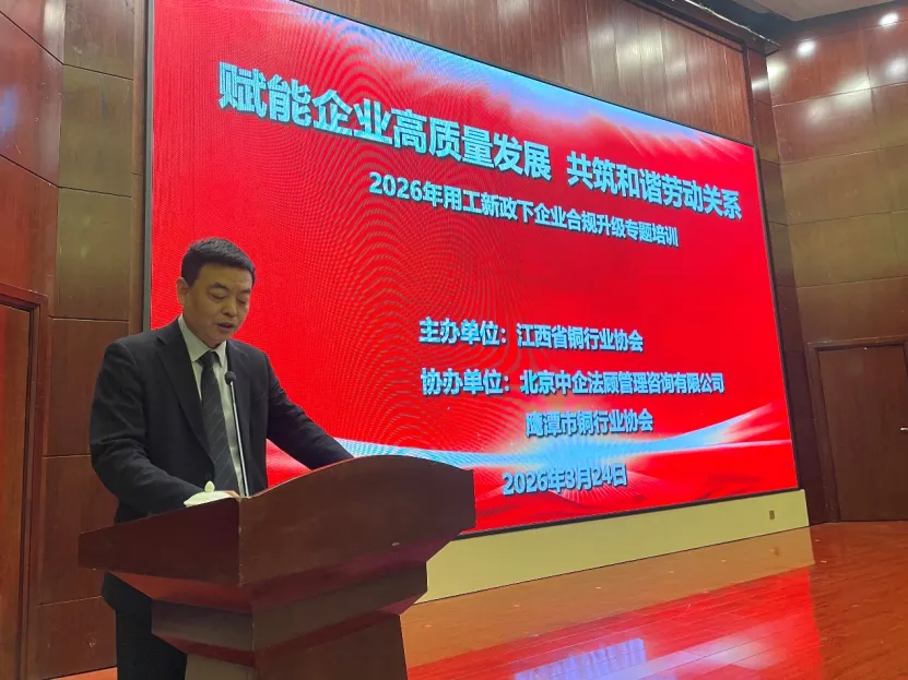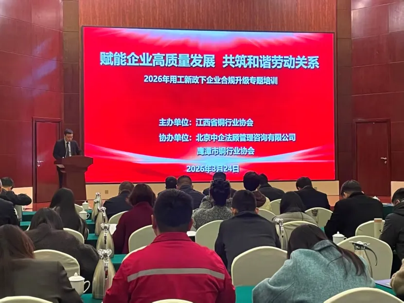 由江西省铜行业协会主办、北京中企法顾管理咨询有限公司与鹰潭市铜行业协会协办的“2026年用工新政下企业合规升级专题培训”,于3月24日在鹰潭市沁庐道苑举行。来自省、市铜行业协会会员单位的150多名代表参加了培训。江西省铜行业协会秘书长李泽、鹰潭市铜行业协会会长易小春、秘书长韩学农出席了培训活动。培训会由江西省铜行业协会常务副会长孙晓风主持。他表示:本次培训旨在帮助会员企业筑牢用工“防火墙”,规避潜在法律风险,为企业的稳健发展保驾护航。企业的稳健发展,离不开安全、合规的内部环境以及法治的营商环境。在当前的经济形势下,用工管理已成为企业经营管理中的重中之重,潜藏的风险点也日益复杂。为了帮助会员企业“防风险、促规范、守底线、保安全” ,省、市铜行业协会特别策划了这场公益培训,希望能为大家带来实实在在的帮助。培训由北京中企法顾管理咨询公司资深专家邬山为大家带来《管控用工风险,保障经营安全》的专题讲座。他针对超龄用工和新入职员工试用期出现的常见问题,结合实际案例,就企业如何掌握合规流程与风险规避路径进行了深入浅出的讲解。培训通过深度政策解读和真实案例复盘等,帮助企业准确把握法律要求,明确责任边界,掌握合规用工的具体实施方法,为促进企业规范用工管理,构建和谐劳动关系提供了有力支持。参加培训的会员企业家表示,讲座中案例丰富、逻辑清晰、方法实用,有很强的指导性和针对性,感到很受启发、很有收获。