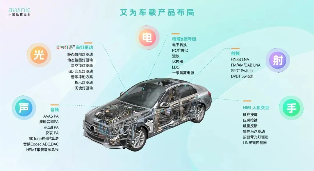 目前,艾为电子的静态&动态氛围灯、音乐律动、ISD交互灯等解决方案已广泛覆盖比亚迪、鸿蒙智行、小米、广汽(含昊铂)、长安(含阿维塔)、奇瑞、零跑等国内主流车企与头部Tier 1供应商,多款核心产品实现规模化量产。其中车规级音频功放芯片AW85601QPR-Q1、氛围灯芯片AW23003QNR-Q1等五款产品成功入编《2025中国汽车芯片供给手册》。在导入主流车企供应链的过程中,艾为电子凭借长期供应可靠性与业务连续性,通过了客户多维度严苛考核,成为国产汽车品牌芯片替代的标杆企业。