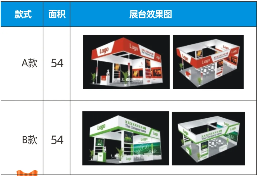 配置:含木制展位结构、门头泡沫字 LOGO 及企业全称、企业形象画面背胶、产品展示柜、接待台、5 套洽谈桌椅、展位基础照明等。