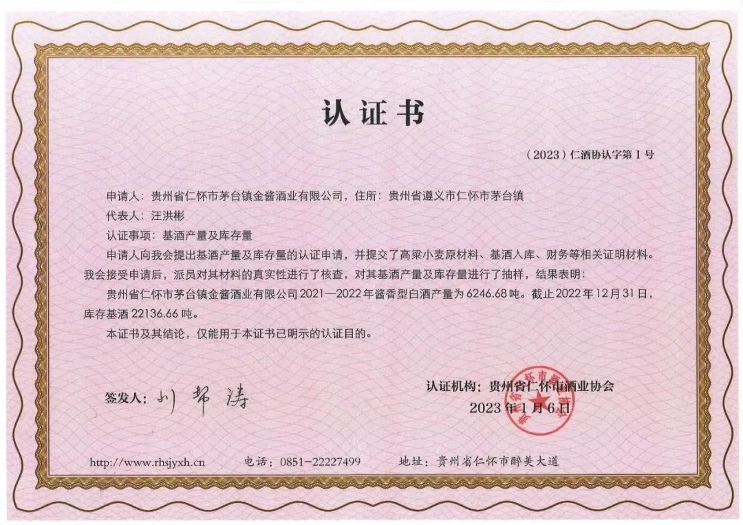 2023年1月6日,贵州省仁怀市酒业协会应金酱酒业申请,对其基酒产量及库存量进行官方认证,将金酱最真实的情况展示给消费者和经销商——金酱酒业2021-2022年酱香型白酒产量为6246.68吨,截止2022年12月31日库存基酒22136.66吨。连续三年进行产量与储量双认证,金酱向行业传递出的这份答卷,表达的不仅是坚定酿好酒的诚心,还有金酱践守品质契约的决心。
