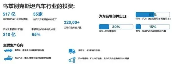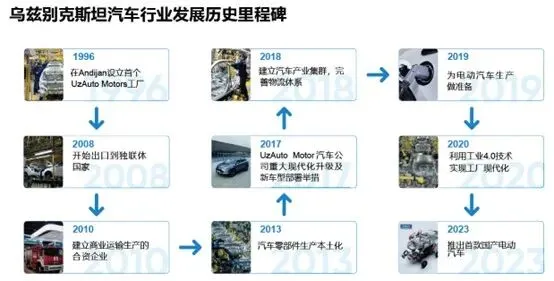 *汽车工业高速发展:汽车工业是乌兹别克斯坦的支柱产业之一。乌兹别克斯坦是中亚国家中最早生产汽车的国家,也是该地区汽车产业链条最为成熟的国家。目前汽车工业已经发展成为该国的支柱产业之一。官方数据显示,乌兹别克斯坦2023年共计生产32.7万辆乘用车,2024年总产量超过35万辆,相比2016年11.5万辆的总产量增长了超过3倍。乌兹别克斯坦计划到2030年将国内乘用车年产量增加到100万辆。