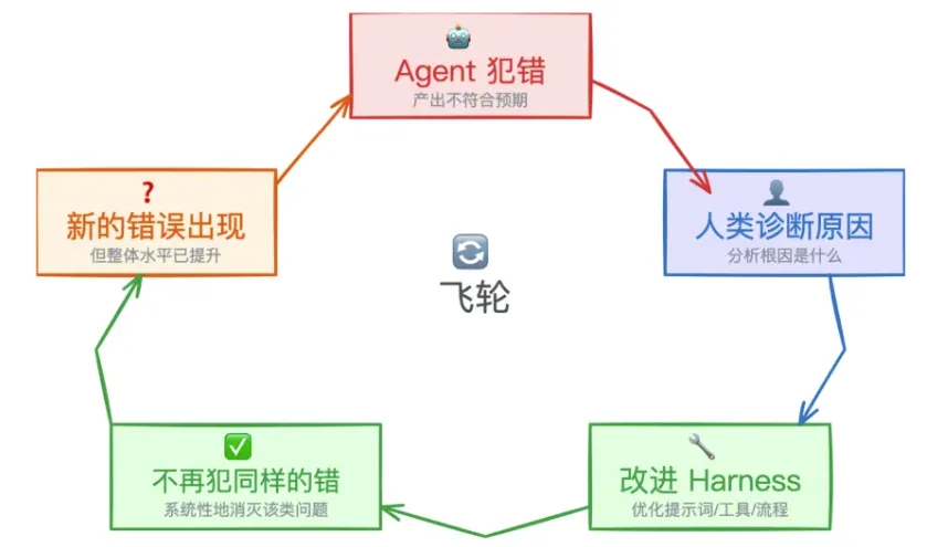 Agent 犯错 → 诊断原因 → 改进 Harness → 下次不再犯 → 新的错误出现 → 循环继续。