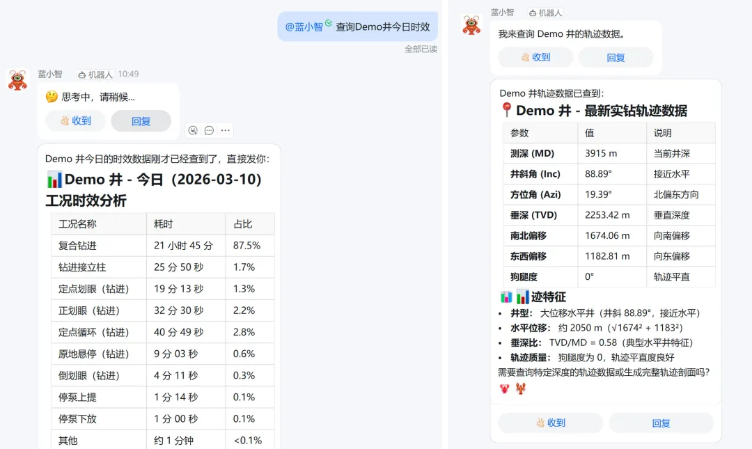 神开蓝海智信依托自研的SKILL技能引擎,结合国内外成熟通用智能大模型,将自研“智能体”深度接入钉钉办公生态,并与神开蓝海智信钻井优化平台无缝对接。该“智能体”化身24小时智能助理,能够自然理解指令、敏捷执行任务,有效解决AI 应用入口深、操作复杂等痛点,让智能体真正融入日常办公与生产流程。· 实时数据穿透:工程师无需再登录钻井优化系统,只需向“神开数字化员工”提问,即可实时调取系统中的井数据、轨迹数据、泥浆性能等信息。