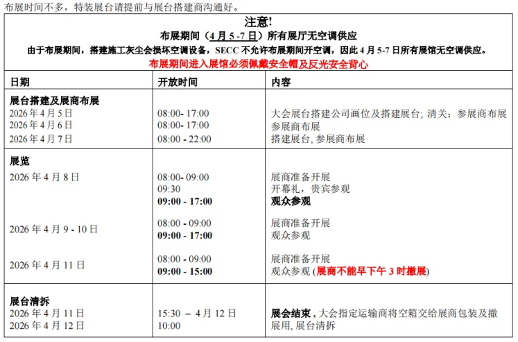 l根据展馆SECC新规定,由2026年1月1日起,如展台需要装修(光地或标摊升级),展商需要另外租电源供装修用途,请提前向展馆租订。