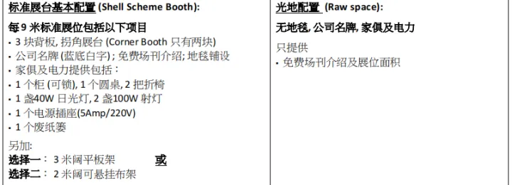 l每9平米标准展位包含1 盏40W 日光灯, 2 盏100W 射灯及1 个电源插座(5Amp/220V ,最大功率600W) 供照明及基本使用。如标准展位需要操作操作大功率机械,请提前向展馆租订适当的电源。