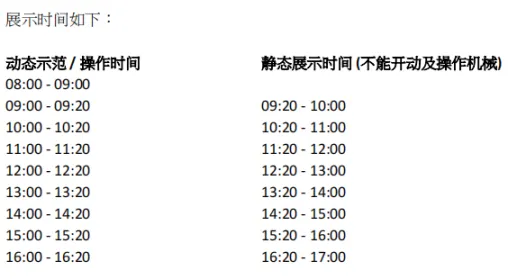 为方便参展商与客人于展会期间多点时间交流,所有梭织型的织布机,于展览会期间必须按照大会拟定的"梭织机械及嘈音机械动态示范时间 ("Weaving machine and noisy machine operating time ") 操作机械. 所有将会展示梭织类型织布机展商必须于参展前填妥并交回主办单位 FORM K , 承诺会依从以下时间表操作其机械。主办单位亦有权现场要求其他声浪过大的机械展商依从以下时间表操作其机械。主办单位亦会停止任何不愿意合作展商的供电,并不作任何赔偿。