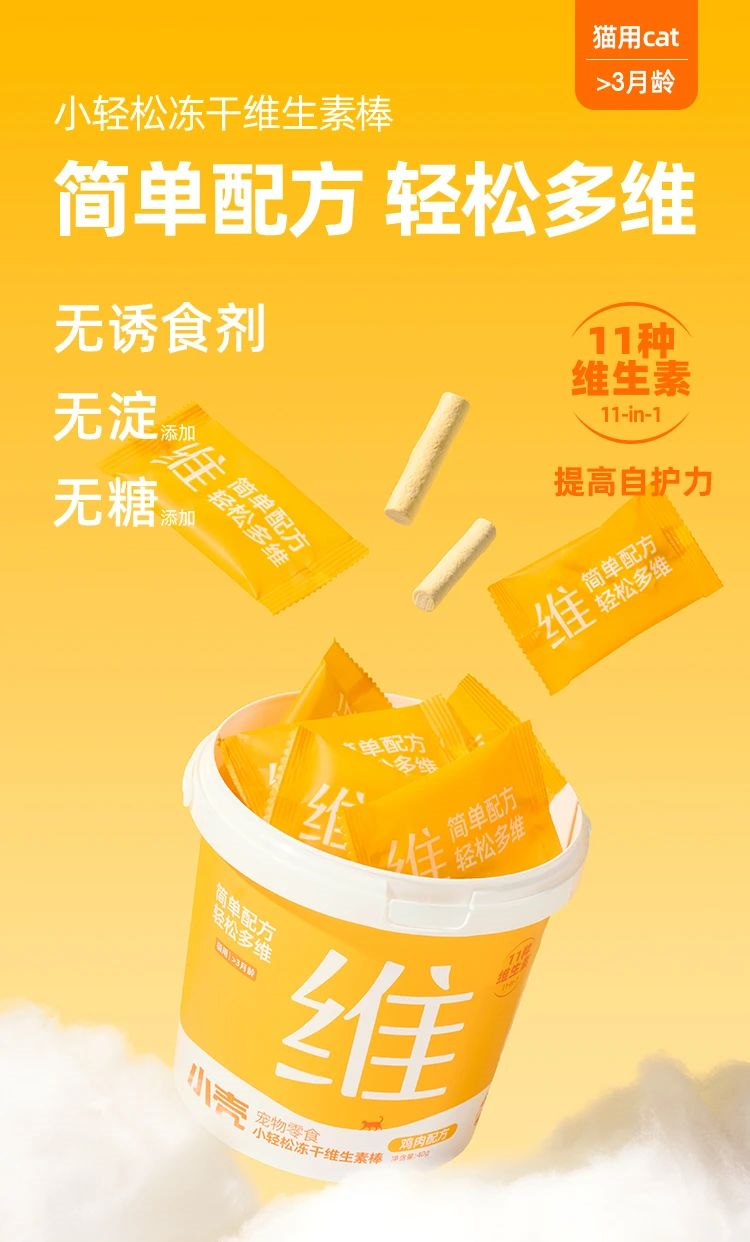 近日,小壳推出了一款适口性好、功能全面、方便喂养的冻干维生素棒。该产品沿袭爆款小轻松系列的「简单配方,轻松营养」的研发理念,解决了传统片剂维生素补充剂宠物不爱吃、配方单一、有效成分含量不明的各项问题。