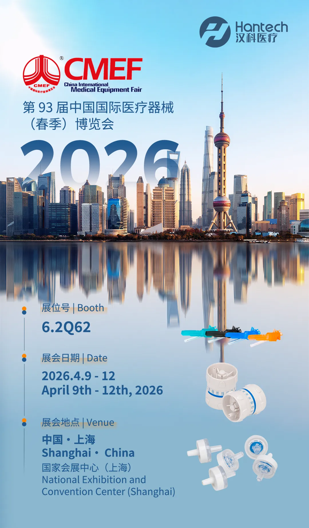 汉科医疗将于2026年4月9至12日在上海国家会展中心参加第93届中国国际医疗器械(春季)博览会。我们期待与您相约展位6.2Q62!Hantech Medical will exhibit at CMEF at the National Exhibition and Convention Center (Shanghai) from April 9 to 12, 2026. Our booth is 6.2Q62. We look forward to seeing you there!