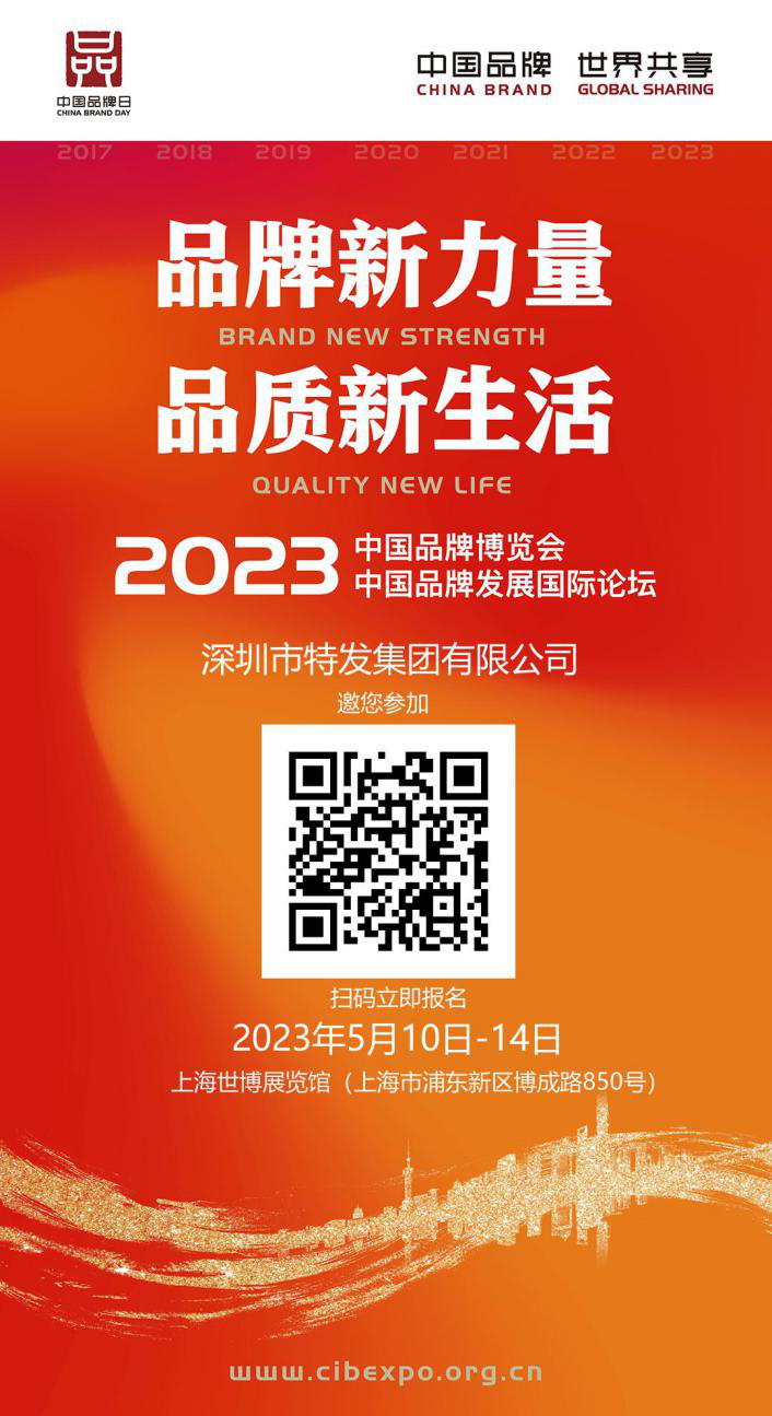 由国家发展改革委联合中共中央宣传部、工业和信息化部、农业农村部、商务部、国务院国资委、市场监管总局、国家知识产权局和上海市人民政府举办的2023年中国品牌日活动将于5月10日-14日在上海举办。深商会理事单位特发集团受邀代表深圳战略性新兴产业企业参加线上、线下展览(深圳展区仅十六家企业参加线下展览),为品牌日增添科技魅力。
