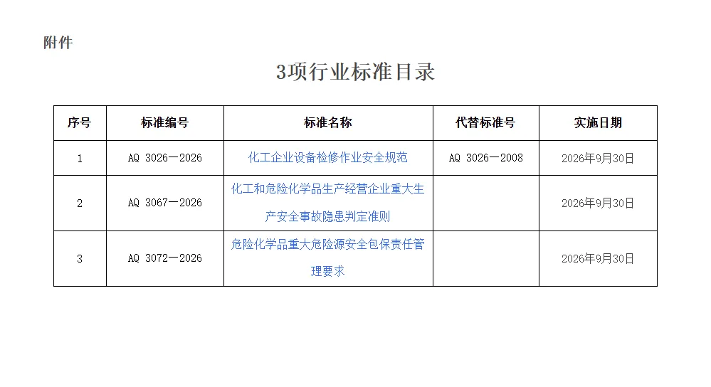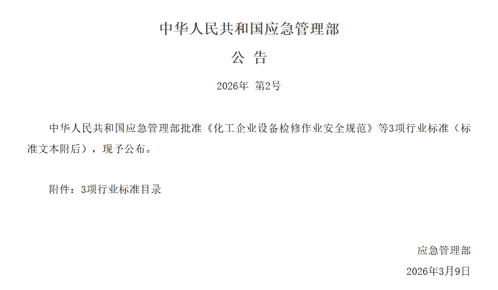 《化工企业设备检修作业安全规范》等3项行业标准公布!