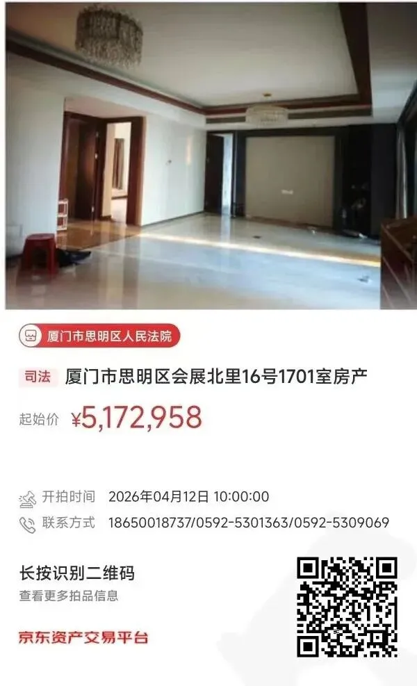厦门市思明区人民法院将于2026年4月12日10时至2026年4月13日10时(延时的除外)在京东司法拍卖网络平台上进行公开拍卖活动。