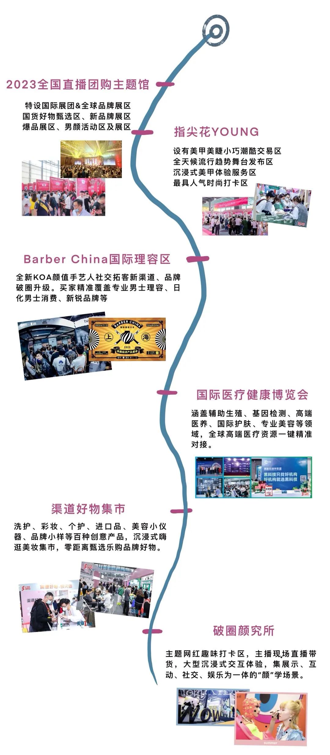 为实现有效的贸易撮合效果,精准扩大美业人的“朋友圈”,这届上海美博会深化融合To B、To K采购模式,结合集群效应、企业优势、主营产品,深度挖掘供采配对需求,推出原创圈层新玩法:“拓新圈、友好抱”——2023全国直播团购主题馆、指尖花YOUNG集市、Barber China国际理容区、国际医疗健康博览会、渠道好物店-集市篇、破圈颜究所等。