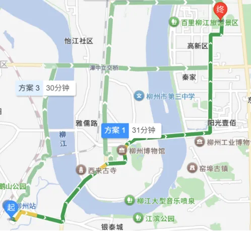 从火车站东广场站(公交站)——飞鹅路——红光大桥——五一路——解放北路——文昌桥——文昌路——桂中大道——高新一路——体育路——体育中心西门(距离8.2公里,约31分钟)