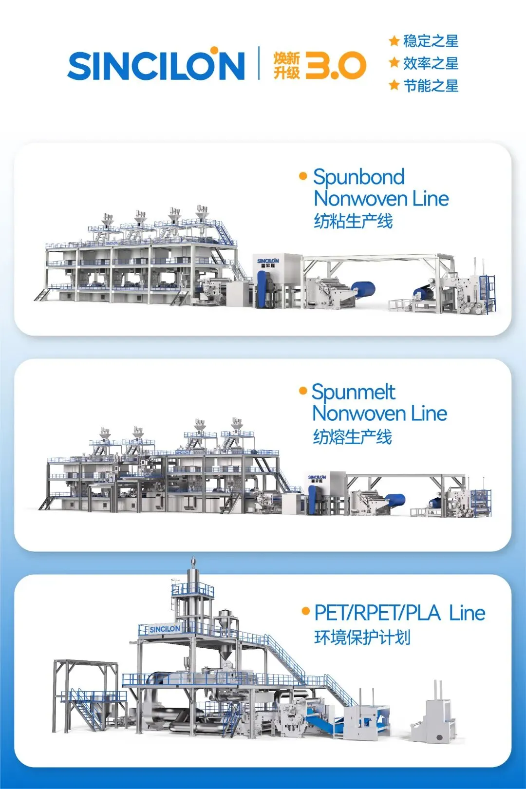 鑫昇隆专注于无纺布聚丙烯纺粘、纺熔及涤纶、聚乳酸和双组份长丝生产线的研发和制造,制品广泛应用于医疗防护、卫生材料、包装、家纺、建筑保温覆盖过滤和日用品等终端产品。