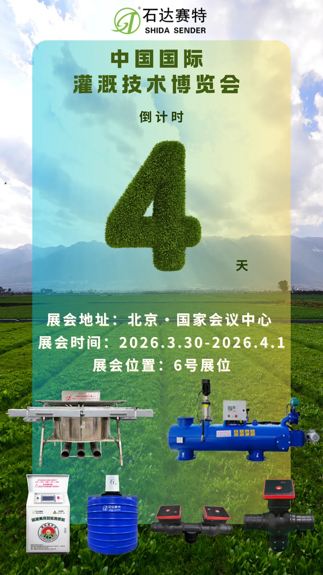 ⏳ 倒计时4天!3月30日—4月1日,石达赛特与您相约北京国家会议中心6号展位。立式泵前过滤器、智能施肥机等核心产品即将登场,诚邀您莅临展位,共话智慧农业节水未来!