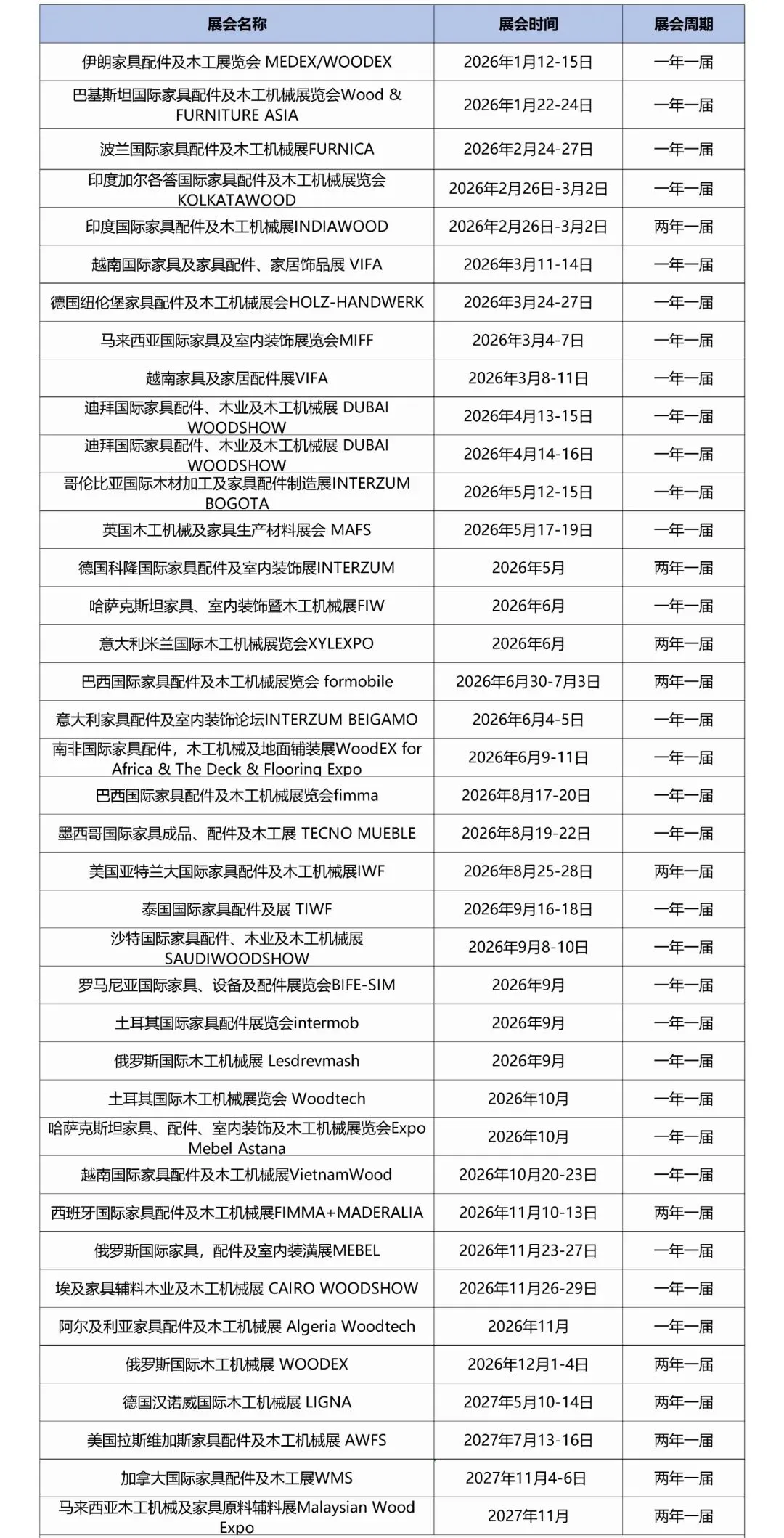 2026年全球木工机械展会计划表