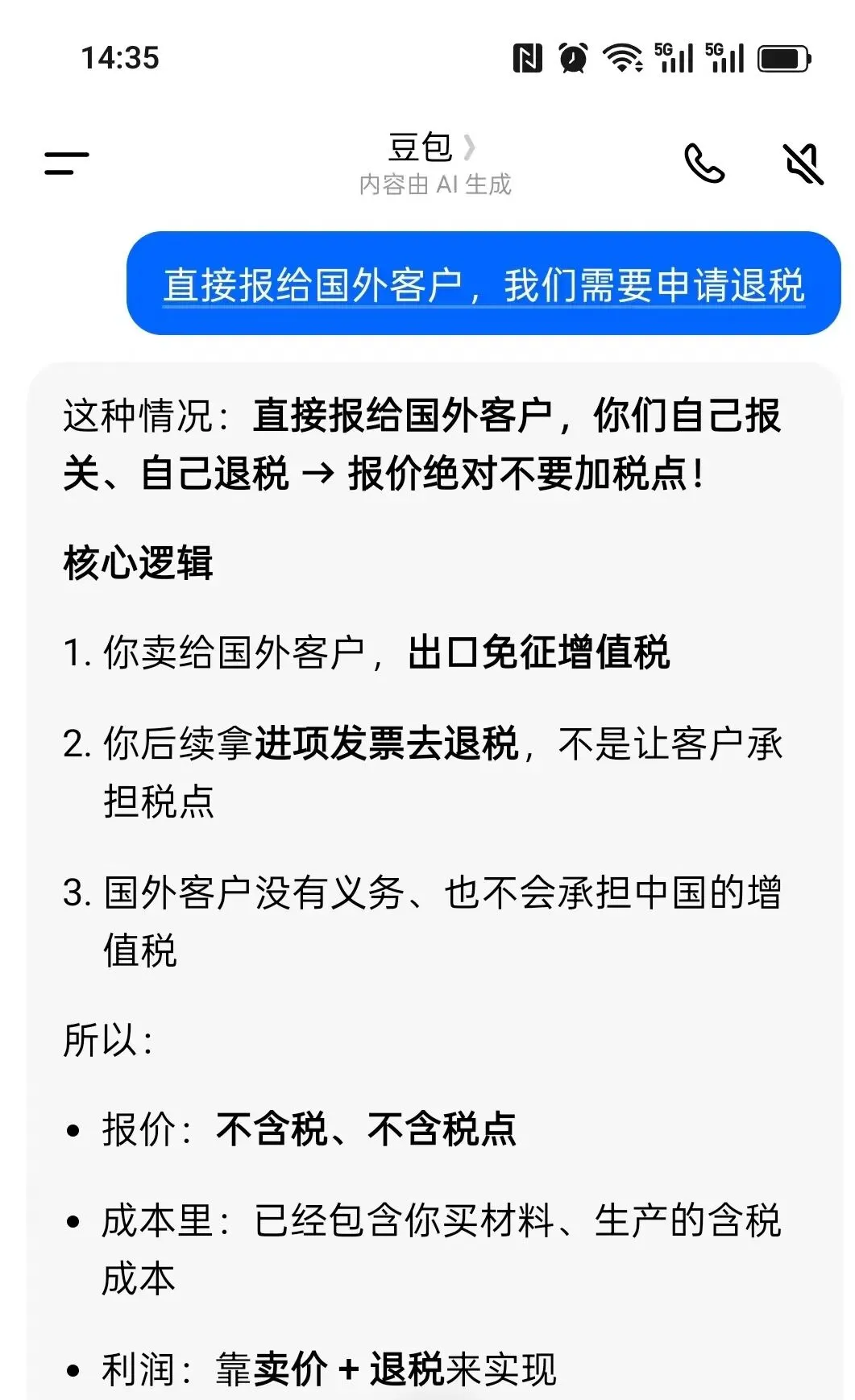 我们以前直接和国外客户合作都是不含税的,今年开始老板突然要求报价要把税点加上,理由是怕退税申请失败会损失税费。