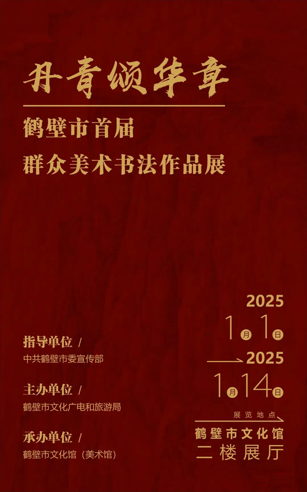 2025年1月3日,由中共鹤壁市委宣传部指导,鹤壁市文化广电和旅游局主办,鹤壁市文化馆(美术馆)承办的“丹青颂华章”鹤壁市首届群众美术书法作品展在鹤壁市文化馆开幕。