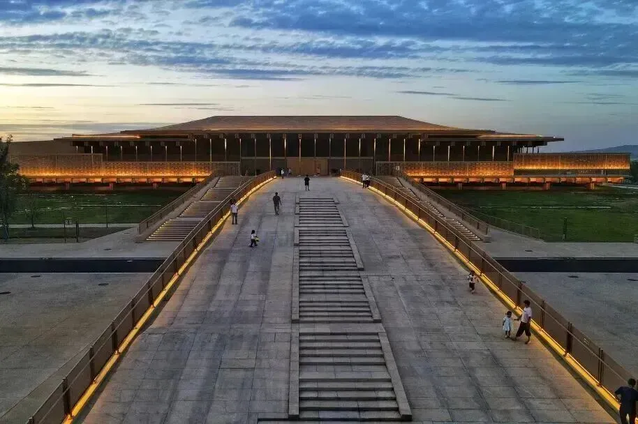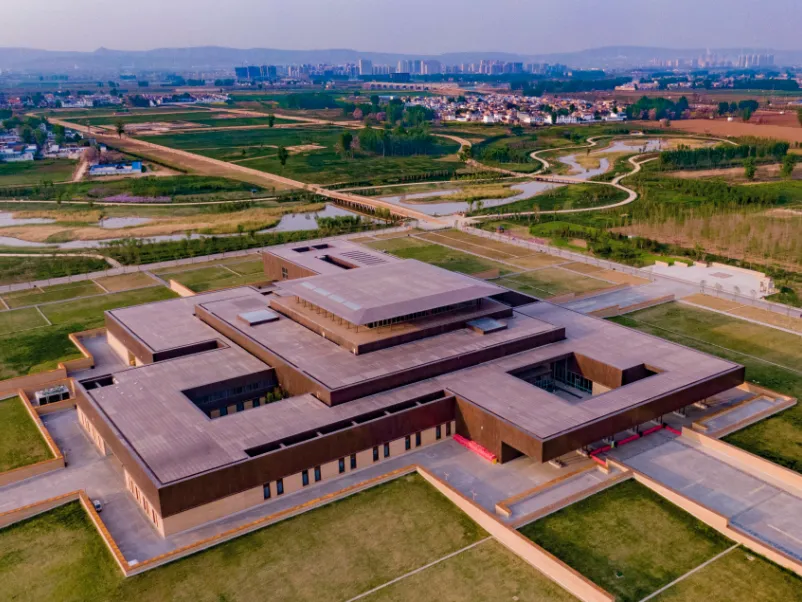 汉魏洛阳故城遗址博物馆的设计灵感来源于汉魏时期的宫殿建筑,整个馆区的空间布局蕴含着汉魏都城规划思想——从空中鸟瞰,汉魏洛阳故城遗址博物馆就像一座微缩的汉魏都城。