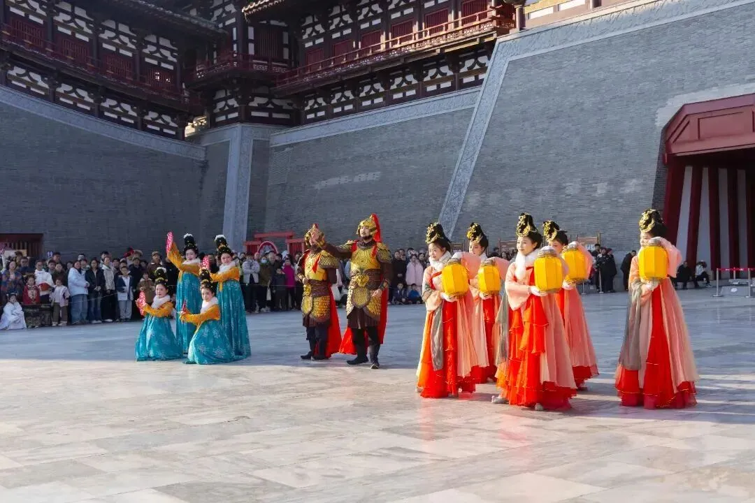 除了参观展区,在这里还可以观摩气势恢宏的 《天门迎宾礼》 ,看威风凛凛的唐代士兵击鼓开城、仕女翩然迎宾,感受“万国来朝”的盛唐气象。《武皇赐福》重现女皇登高祈福的盛大场景。更有《神都芳华》系列NPC互动演出,沉浸式梦回神都。