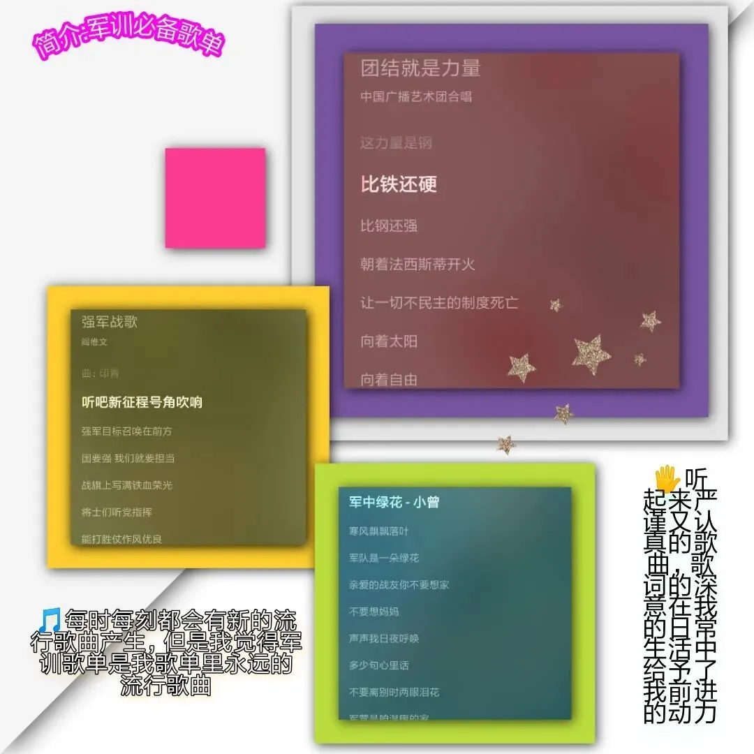 在军训这段时间,每天几乎都重复几个动作,很枯燥,但也因此,我发现自己心性和性情都得到了磨练。在军训休息期间,很多小伙伴会站起来表演自己的才艺,有人唱歌,有人跳街舞,有人讲笑话......一个个都很勇敢,很厉害,很棒,让我知道,原来世界那么大,那么精彩。