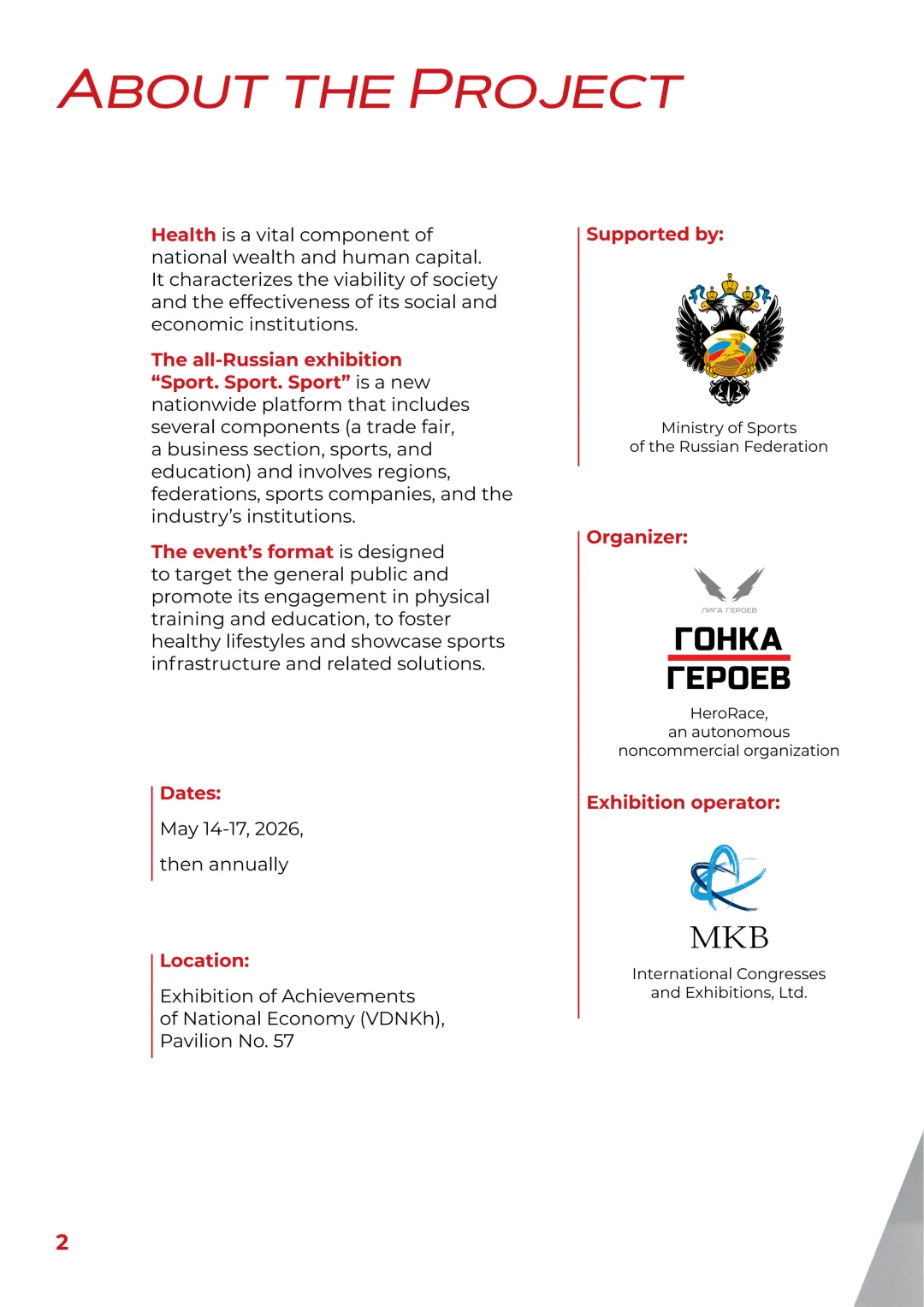 作为东欧地区最具影响力的体育产业综合平台,2026年第16届俄罗斯体育博览会 SPORT SPORT SPORT 将于 2026年5月14日-17日 在莫斯科国民经济成就展览馆(VDNKh) 盛大举行。展会一年一届,由HeroRace主办,中国总代理——上海晖众展览有限公司现正式启动中国企业参展报名工作!