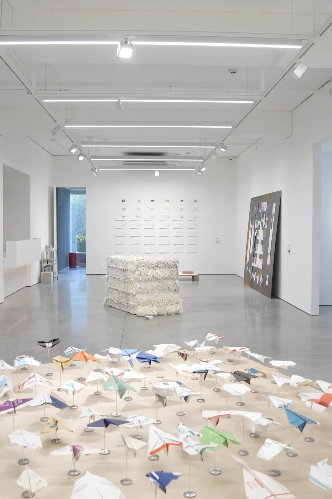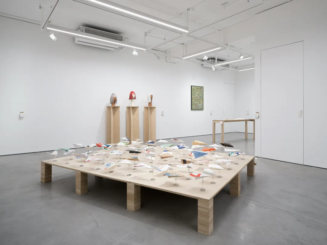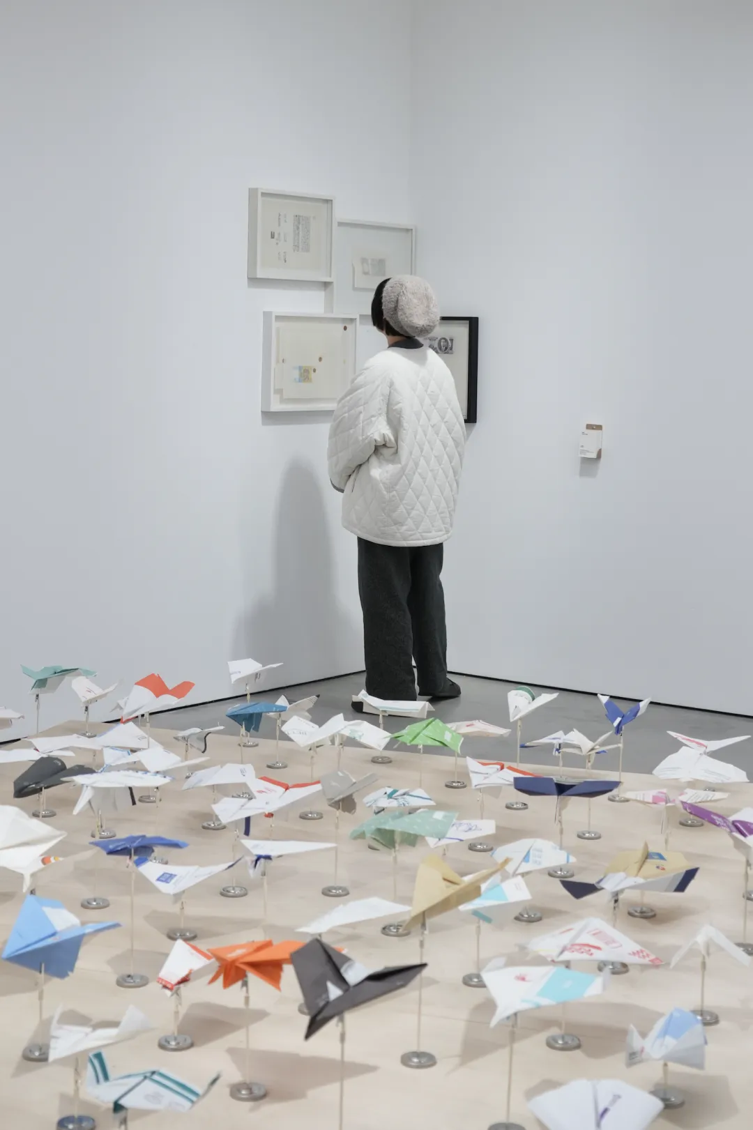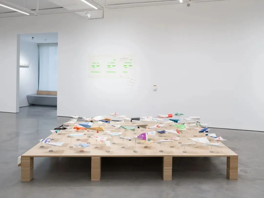 这样的情境下,折叠是一种顺理成章的动作。人们常会无意识地用手去折叠、撕扯或涂画随手可得的纸制品,以对抗无聊与等待。那些印着不同航司标识的呕吐袋,本是为高空中可能出现的不适而准备,在这里却被折叠成各自航司的「迷你飞行器」。当这些纸飞机被不断积累、并聚集呈现时,它们既构成了全球航空系统的缩影,也清楚地指出了一种被制度性忽略的剩余时间。
