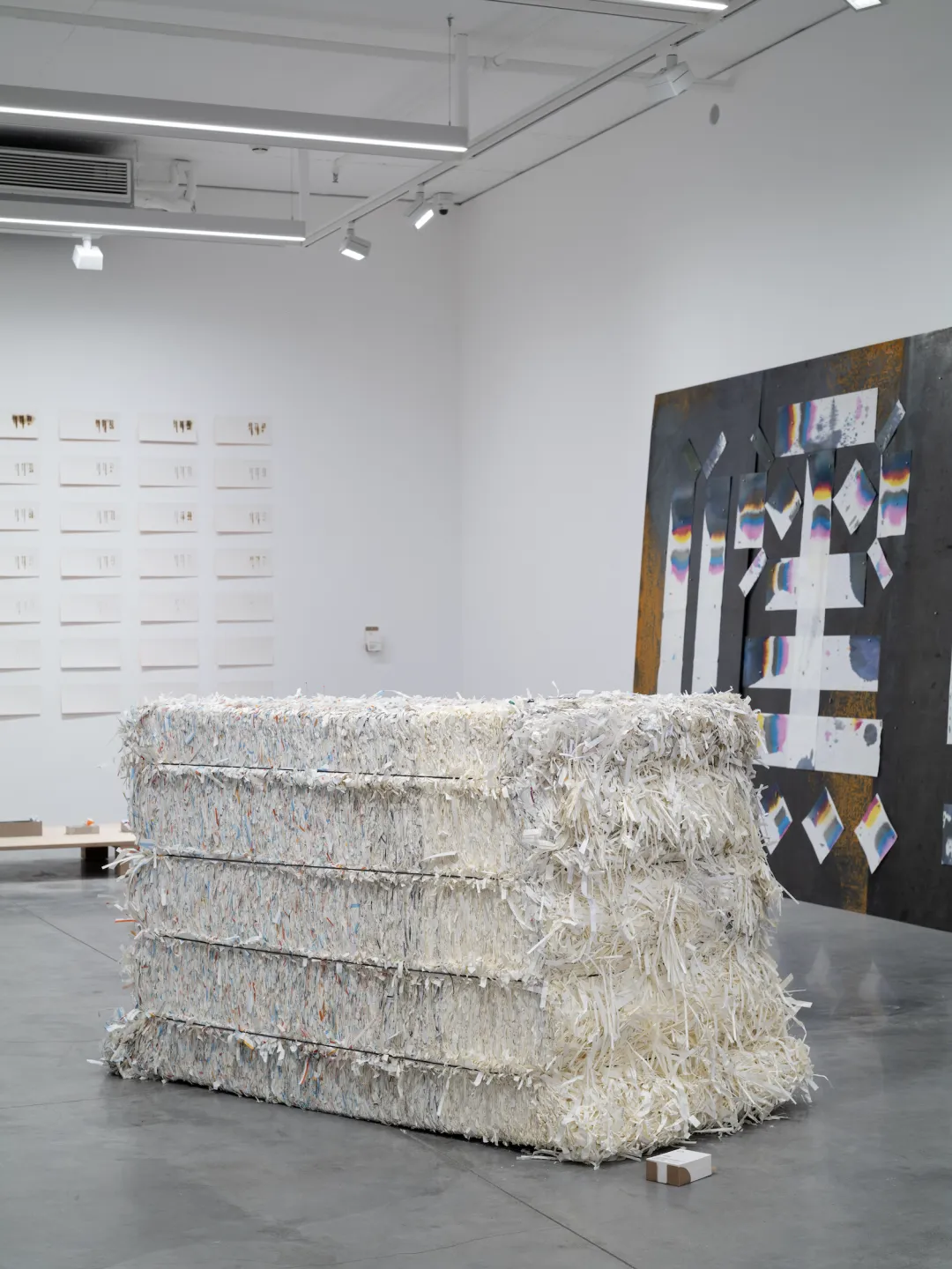 现代化的印厂早已配置了大量机械化的环保装置。在 SD (T) P 的车间上空,常见到直径半米左右的管道,这些管道将不同环节裁切下来的纸边依靠风力抽吸至车间外的一个小厂棚,在这里,机械装置直接将纸碎挤压成块,等待统一回收。这些纸碎形成的立方体有着随机生成、却又极具特征的表面肌理,每一个单元的重量在 400 公斤左右 —— 沉重而又静谧,拥有着与帕特农神庙石柱般的史诗感和悲剧色彩。当我看到这些堆积的纸块时,我推翻了之前的所有想法,我只想把它们带到展览的现场。