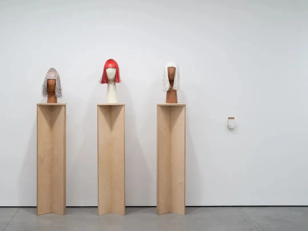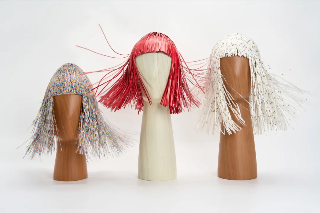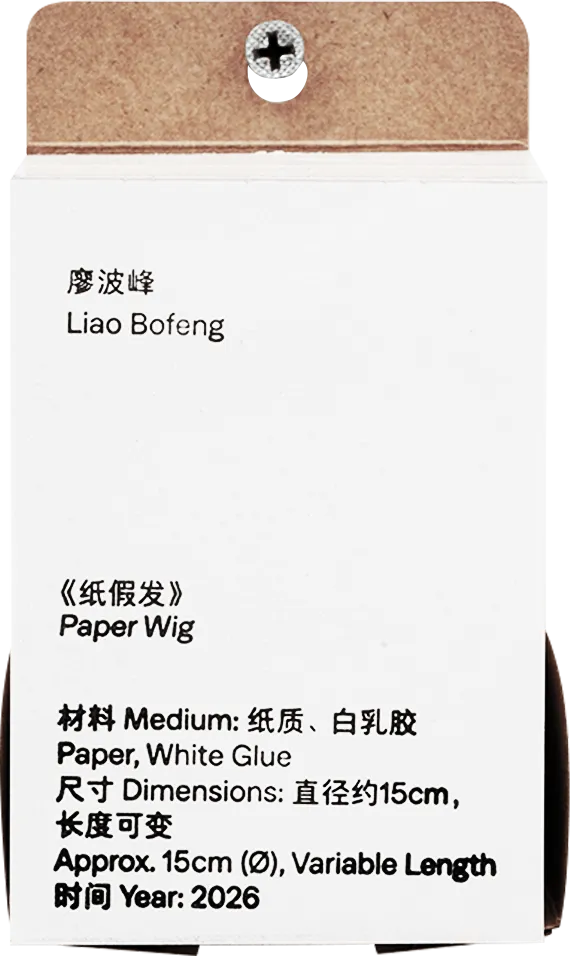 这些纸条,是印刷品在裁切工序后的“边角余料”。我将它们收集起来,用白乳胶一条条手工粘合、叠加,制成一顶假发。由此,工业裁切后的“废纸条”与日常梳妆的“发条”产生了一次幽默的关联。每一次裁切,纸条的粗细、纹样都充满随机性,正如每个人的发丝都独一无二。这不仅是对废弃物的重塑,更是对标准化生产之外,那些“意外之美”的致敬。