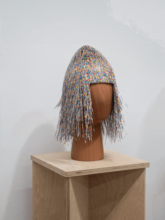 These paper strips are the “leftovers” from printing trims.I collected them, layering and bonding each strip by hand with white glue to form a wig. Here, the discarded “paper strips” playfully connect to the idea of “hairsprings.”Every trim yields strips of varying widths and patterns, much like our unique strands of hair. This piece is not just a re-creation of waste, but a tribute to the unexpected beauty beyond standardized production.