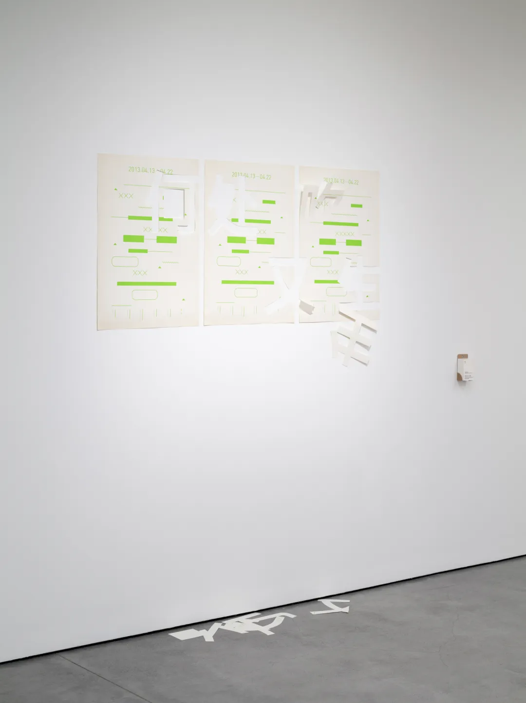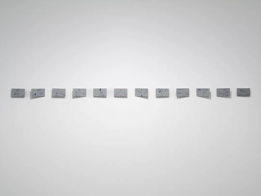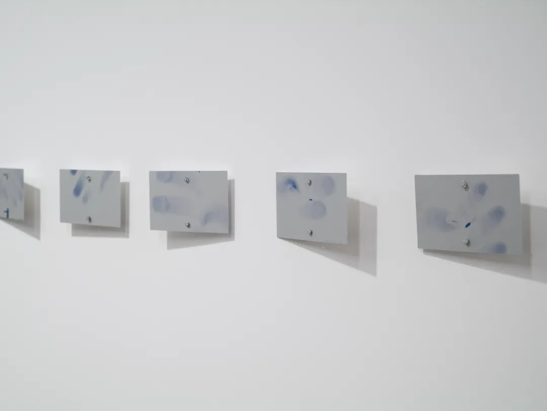 在大约一个月的时间里,这些布满油墨的无尘纸被持续收集并标记日期。随后将纸条裁切成不同长度,按照汉字笔画的书写顺序,以磁铁固定在旧铁板上,拼接成“嘿!”。