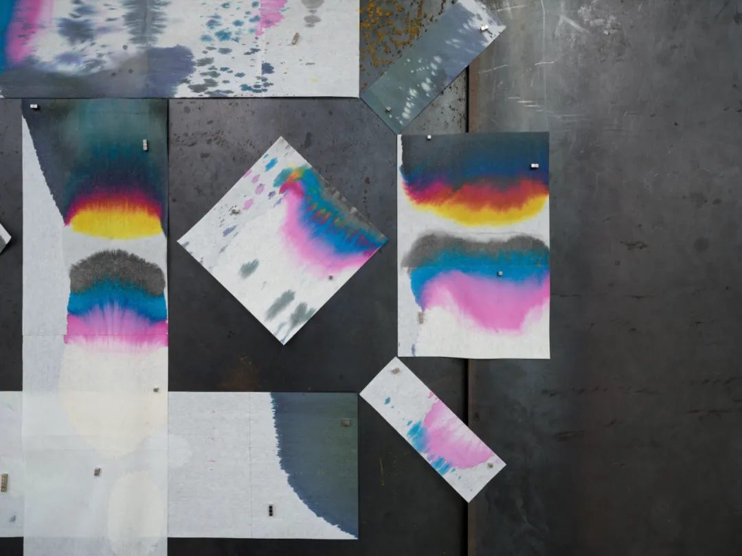 工业无尘纸常用于承接高清UV印刷机运行过程中滴落的残墨。通常在当天印刷任务完成后,这些纸张便会被摘取并丢弃。由于每天印刷内容不同,青(C)、品红(M)、黄(Y)、黑(K)以不同比重滴落,并在纸纤维中自然晕染,形成深浅交织的色斑与纹理,在视觉上呈现出近似羽毛或翼状的细密层次。这些变化的、无意识生成的墨迹,为高度自动化的生产过程赋予了一种微妙的叙事性——它们既是多余的墨水,也仿佛机器在持续运转中留下的“汗水”。