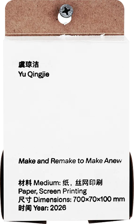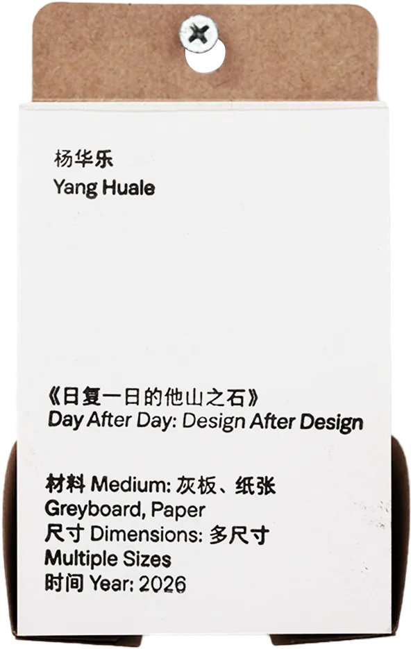 《日复一日的他山之石》是一件从包装材料本身出发的反向设计实验。作品选取茶叶礼盒生产过程中被剩余或废弃的裱纸材料,通过重新整理与揉捻,将这些曾经用于“装饰外表”的纸张反向堆叠进灰板结构之中,使其从表层回到内部。