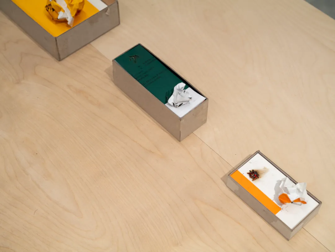 蜉蝣:将设计打样所用的工程纸折叠成纸飞机。纸飞机由我的外甥完成折叠,我记录下其飞行的过程。余料纸张折叠的层次,与纸飞机的飞行记录,共同完成对时间与瞬间的捕捉。