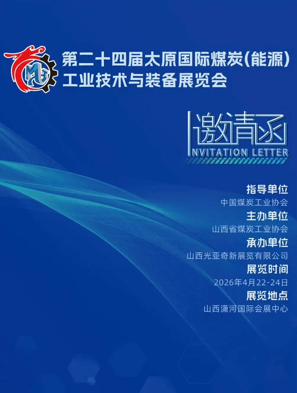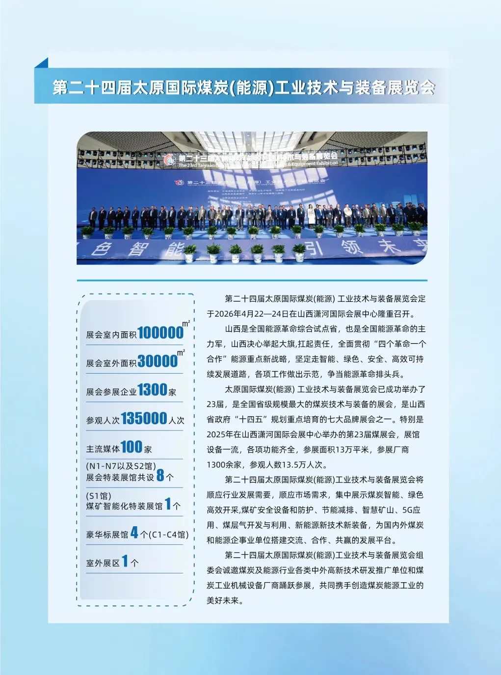 第二十四届太原国际煤炭(能源)工业技术与装备展览会定于2026年4月22—24日在山西潇河国际会展中心隆重召开。山西是全国能源革命综合试点省,也是全国能源革命的主力军,山西决心举起大旗,扛起责任,全面贯彻“四个革命一个合作”能源重点新战略,坚定走智能、绿色、安全、高效可持续发展道路,各项工作做出示范,争当能源革命排头兵。太原国际煤炭(能源)工业技术与装备展览会已成功举办了23届,是全国省级规模最大的煤炭技术与装备的展会,是山西省政府“十四五”规划重点培育的七大品牌展会之一。特别是2025年在山西潇河国际会展中心举办的第23届煤展会,展馆设备一流,各项功能齐全,参展面积13万平米,参展厂商1300余家,参观人数13.5万人次。