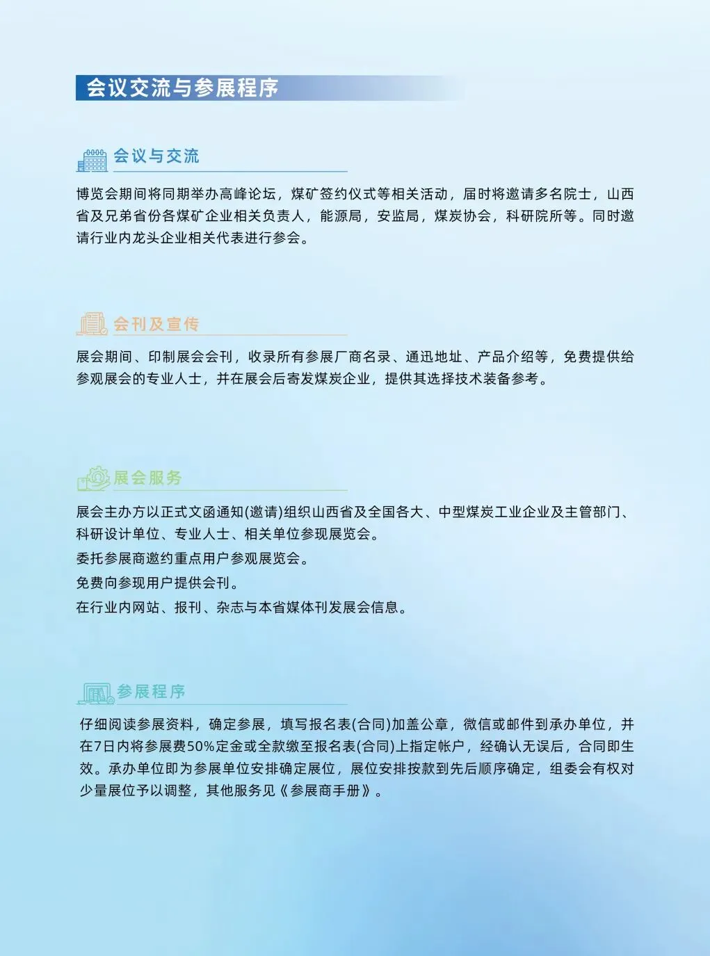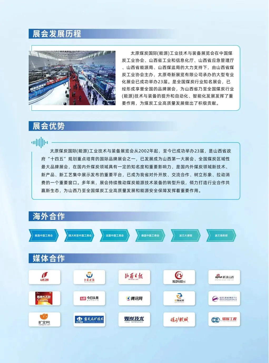 第二十四届太原国际煤炭(能源)工业技术与装备展览会将顺应行业发展需要,顺应市场需求,集中展示煤炭智能、绿色高效开采,煤矿安全设备和防护、节能减排、智慧矿山、5G应用、煤层气开发与利用、新能源新技术新装备,为国内外煤炭和能源企事业单位搭建交流、合作、共赢的发展平台。第二十四届太原国际煤炭(能源)工业技术与装备展览会组委会诚邀煤炭及能源行业各类中外高新技术研发推广单位和煤炭工业机械设备厂商踊跃参展,共同携手创造煤炭能源工业的美好未来。