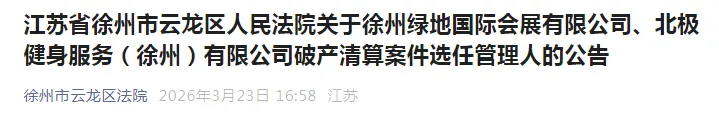 3月23日,徐州市云龙区人民法院发布了《江苏省徐州市云龙区人民法院关于徐州绿地国际会展有限公司、北极健身服务(徐州)有限公司破产清算案件选任管理人的公告》,预示着徐州绿地国际会展有限公司开始破产清算。
