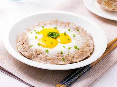 肉饼蒸蛋、糖醋藕丝、青菜粉丝汤、燕麦米饭